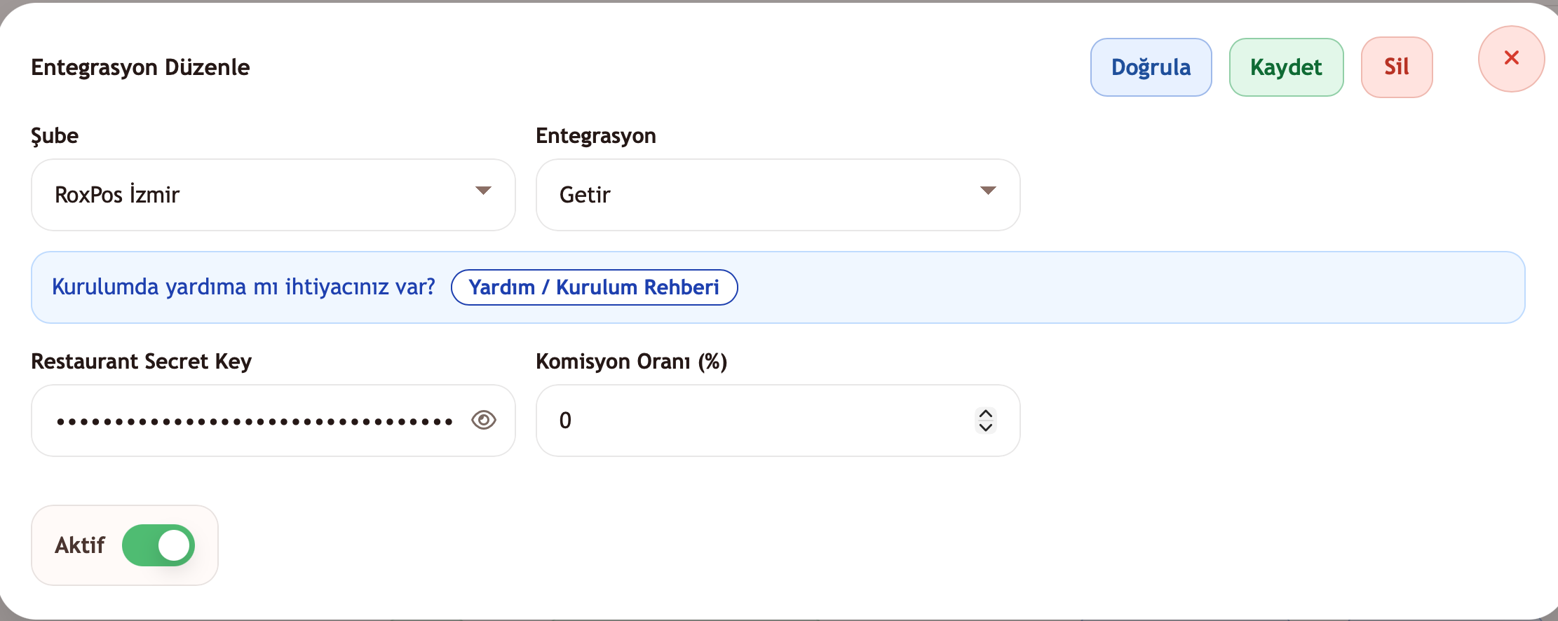 - Restoran Durumu anahtarını aktif edin ve Restoran Secret Key bilgisini kopyalayın.