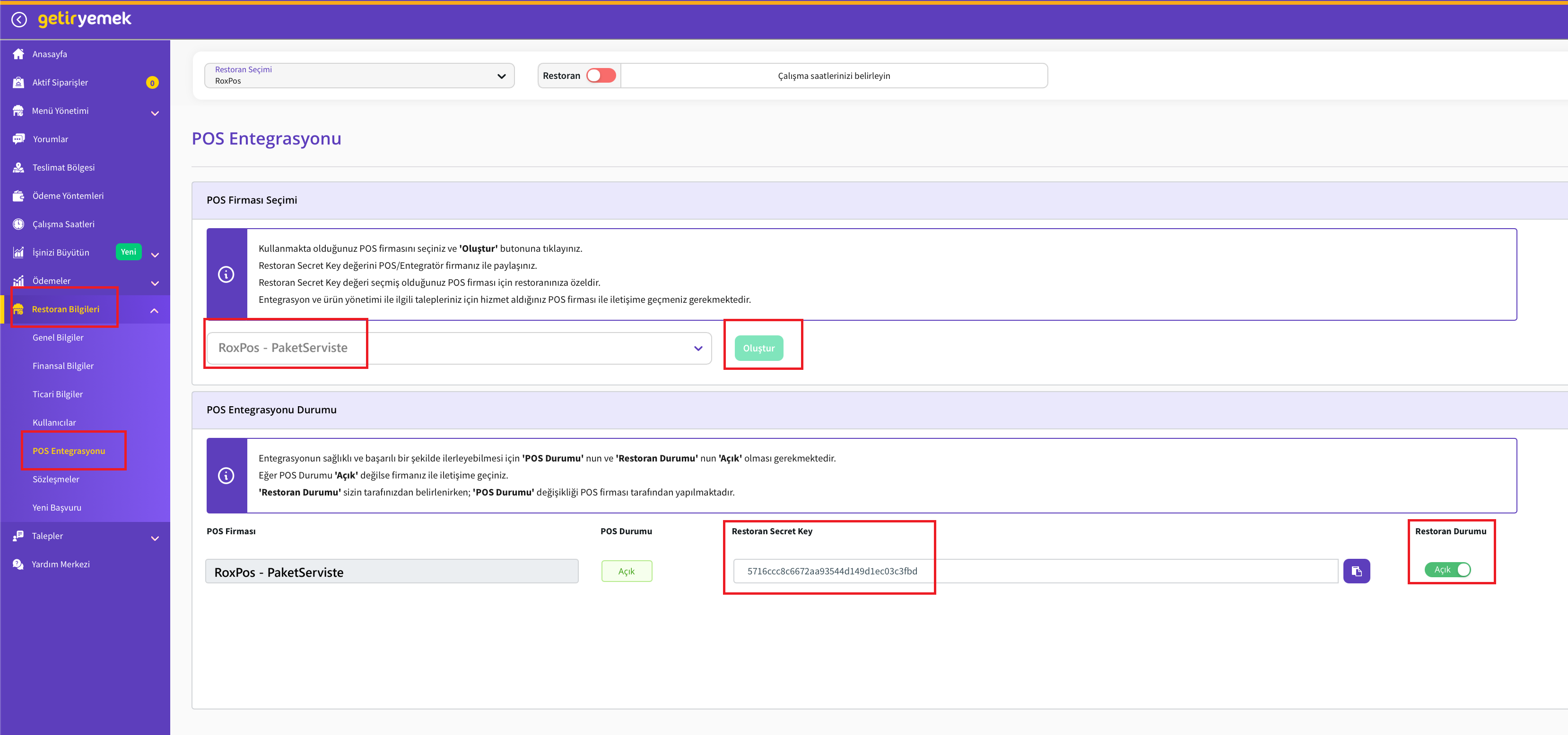- Restoran Bilgileri altındaki POS Entegrasyonu menüsüne geçin.